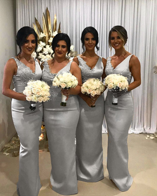 Sheath Bridesmaid Dresses Satin V Neck Appliques