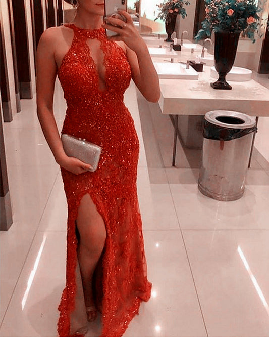 Elegant Halter Lace Mermaid Split Dresses With Tulle Skirt