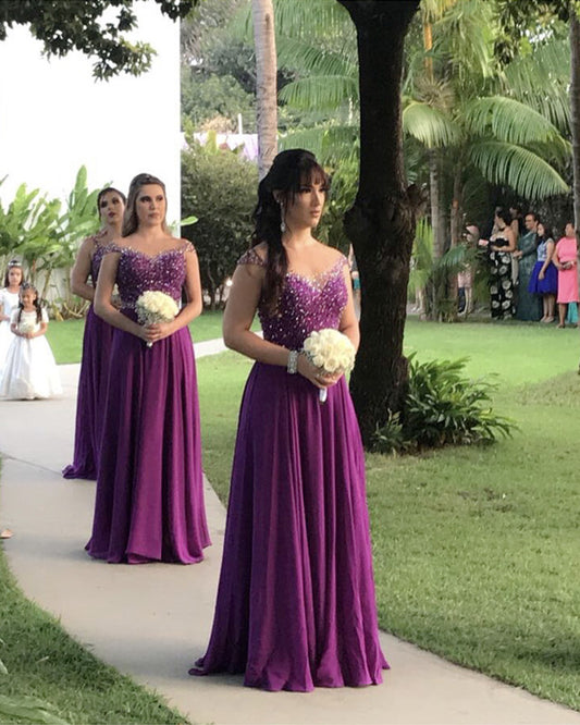 Sheer Neckline Chiffon Beaded Bridesmaid Dresses