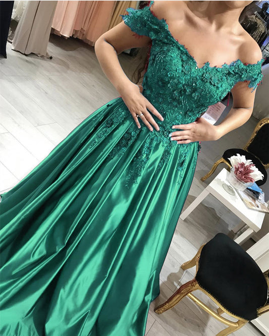 A-line Prom Dresses Satin Off Shoulder Lace Beaded
