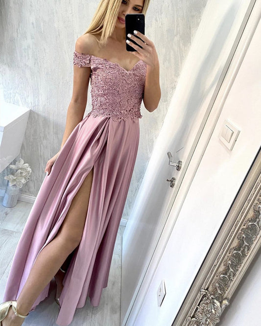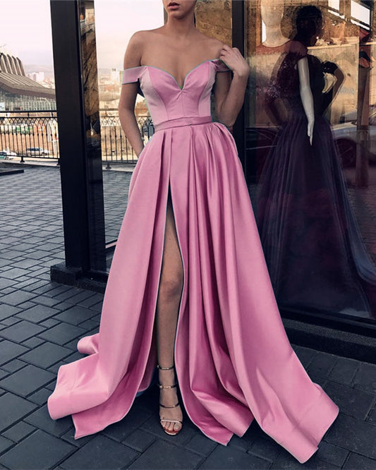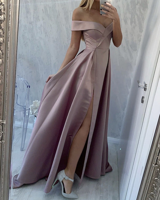 Long Satin Bridesmaid Dresses Split Off Shoulder