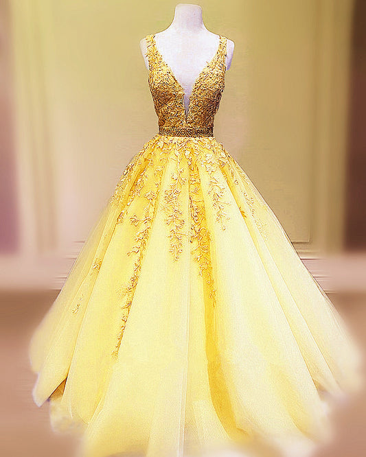 Tulle V Neck Prom Dresses Lace Embroidery Ball Gown