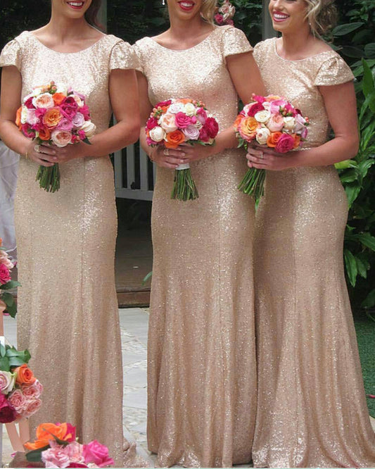 Rose Gold Sequin Bridesmaid Dresses Mermaid Cap Sleeves