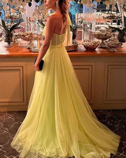Daffodil Tulle Corset One Shoulder Slit Dress