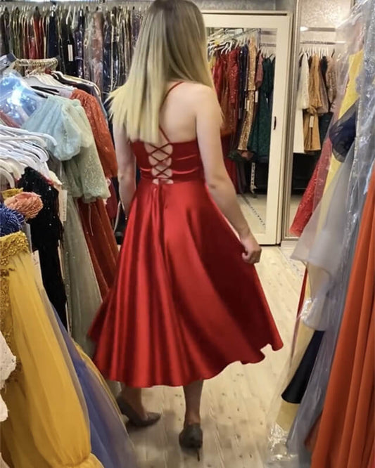 Red V-neck Satin Midi Corset Dress