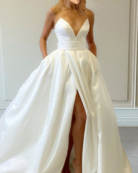 Sleeveless Satin Split Beach Wedding Dress With Pockets