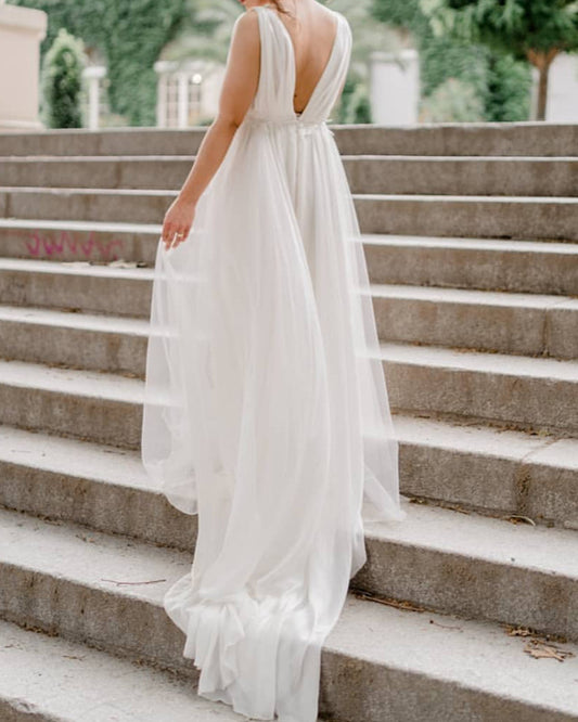 Simple Boho Wedding Dresses Tulle Pleated V Neck