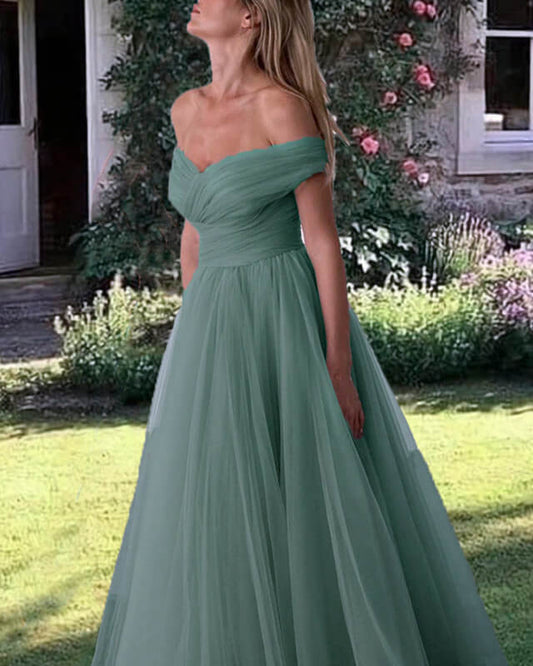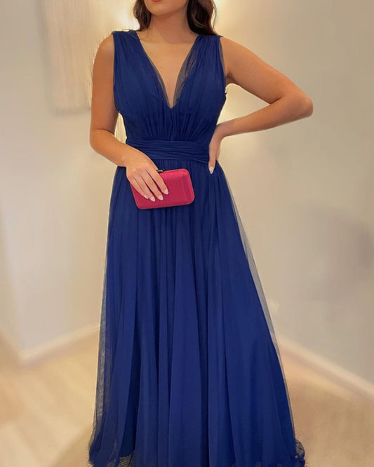 Modest Blue Tulle Puffy Sleeve Prom Dress
