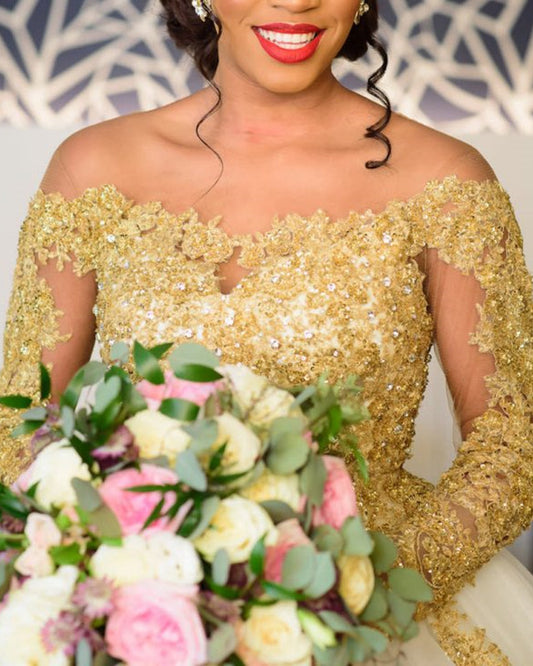 Gold Lace Wedding Dress Ball Gown Long Sleeves
