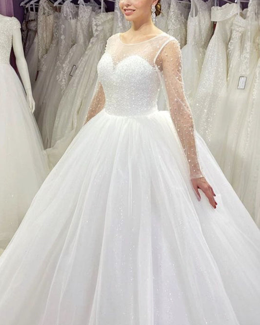 Ball Gown Wedding Dresses Sparkly Long Sleeves Sheer Neck
