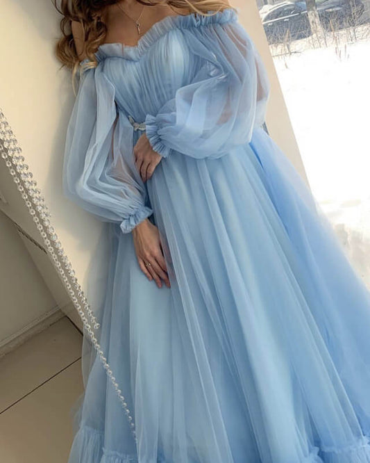Light Blue Tulle Ball Gown Ruffles Appliques Dress