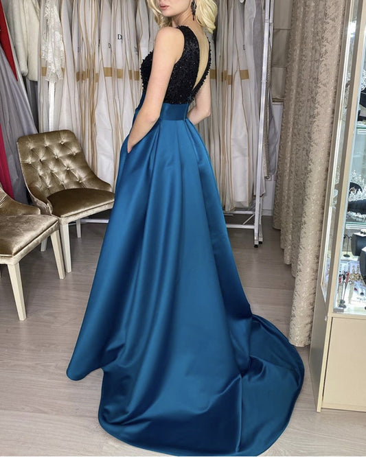 Black Sequins Beaded Top Satin Dresses With Pockets