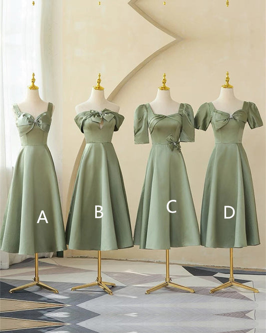 Mixed Style Sage Green Satin Midi Bridesmaid Dresses