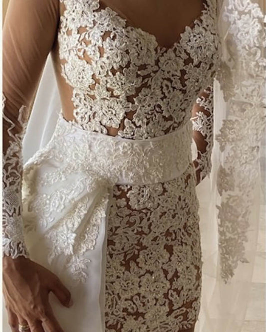 Boho Lace Sheer Wedding Dress Removable Skirt