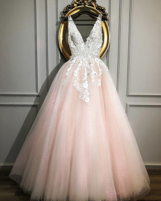 Ivory Lace V Neck Tulle Prom Dresses Floor Length