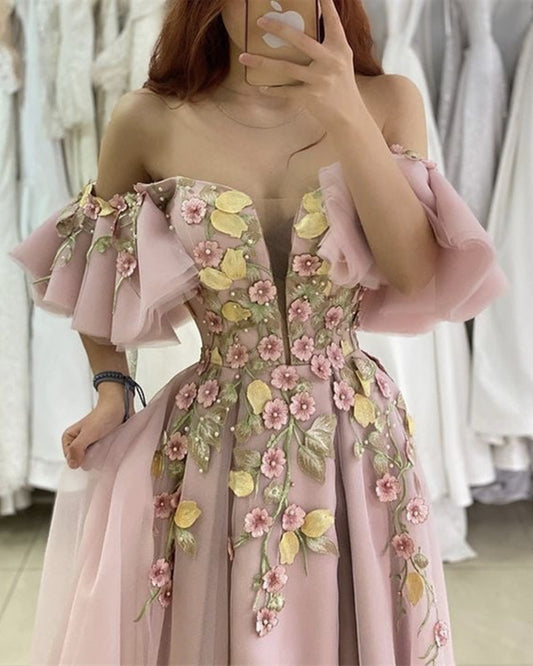 Long Tulle Prom Dresses Lace Embroidery Ruffles Sleeves