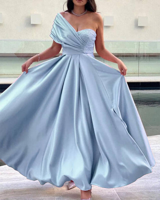 Aqua Blue Satin Removable Sleeve Ball Gown
