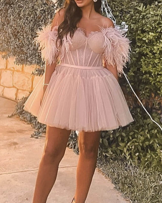 Short Pink Corset Tulle Homecoming Dresses With Feather