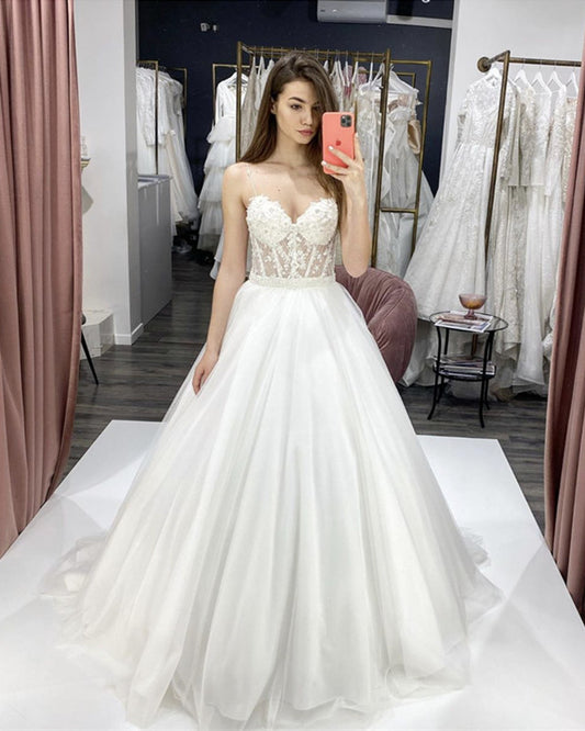 Elegant Lace V Neck Tulle Dresses For Weddings