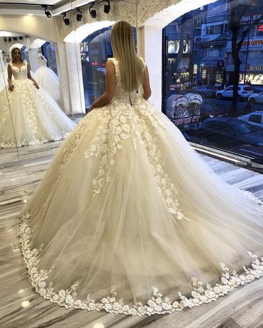 Spaghetti Straps Wedding Dress Ball Gown With 3D Floral Lace