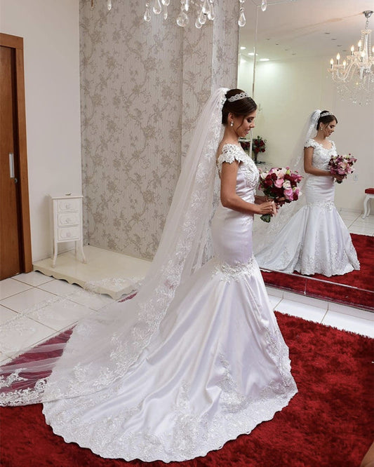 Lace Cap Sleeves Satin Mermaid Wedding Dress Sheer Neckline