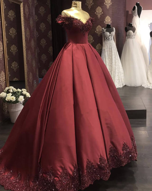 Green Ball Gown Lace Appliques Off-shoulder Satin Dress