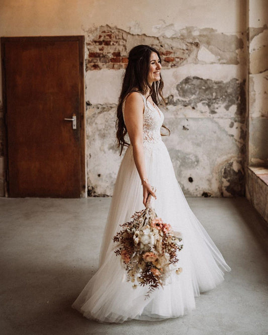 Flowy Tulle Wedding Dress V Neck Lace Appliques