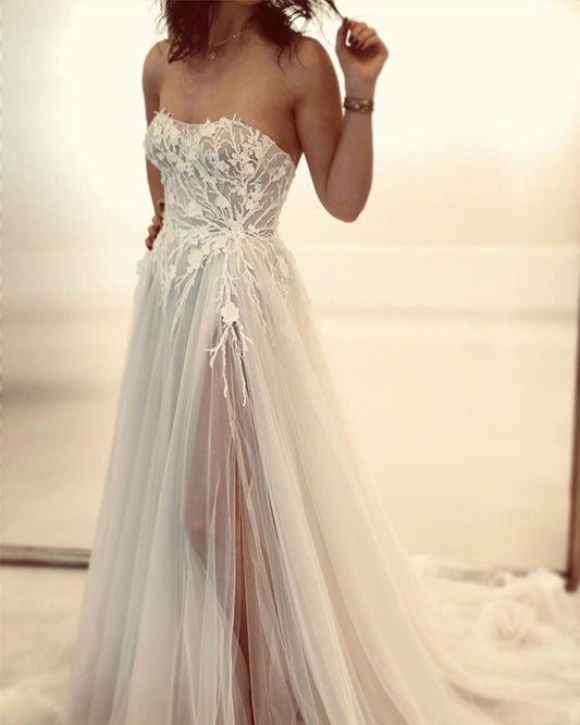 Sexy Boho Wedding Dress Lace Embroidery Tulle Split