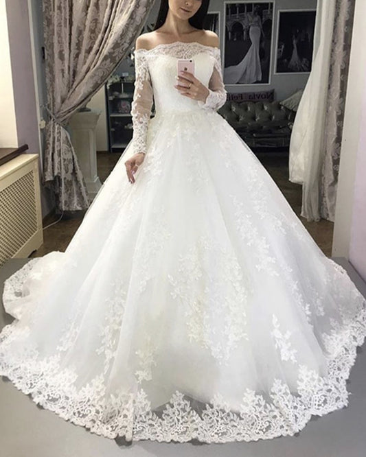 Vintage Lace Long Sleeves Wedding Dress Ball Gown Off Shoulder