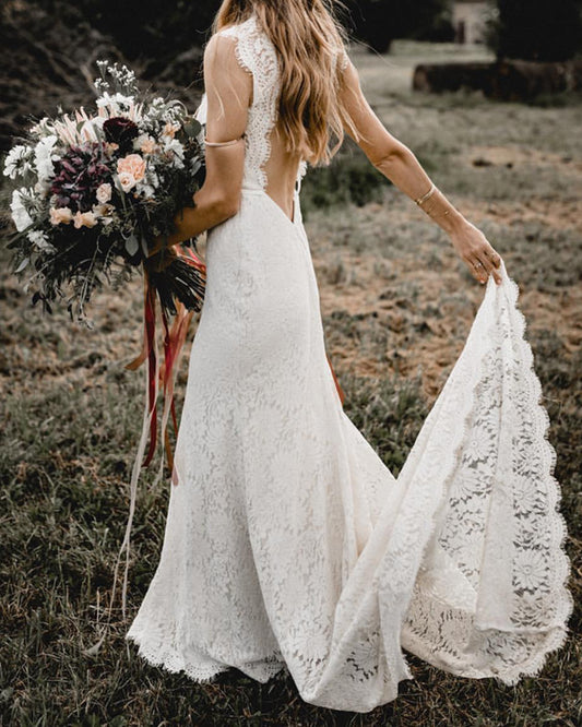 Lace Mermaid Wedding Dress Round Neck Open Back