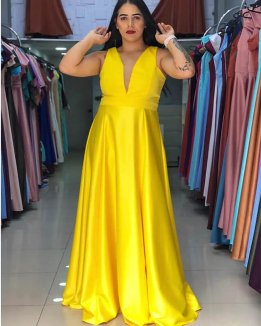 Plus Size Yellow Satin Bridesmaid Dresses V-neck