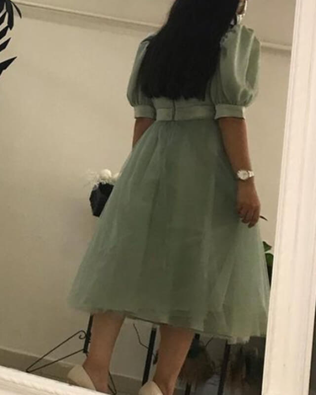 cottagecore style sage colored tulle v neck puffy sleeve dress