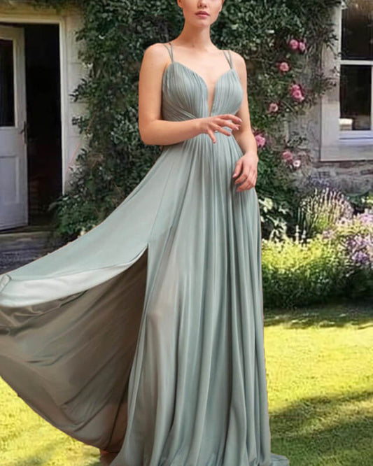 Spaghetti Straps Dusty Sage Chiffon High Slit Dress