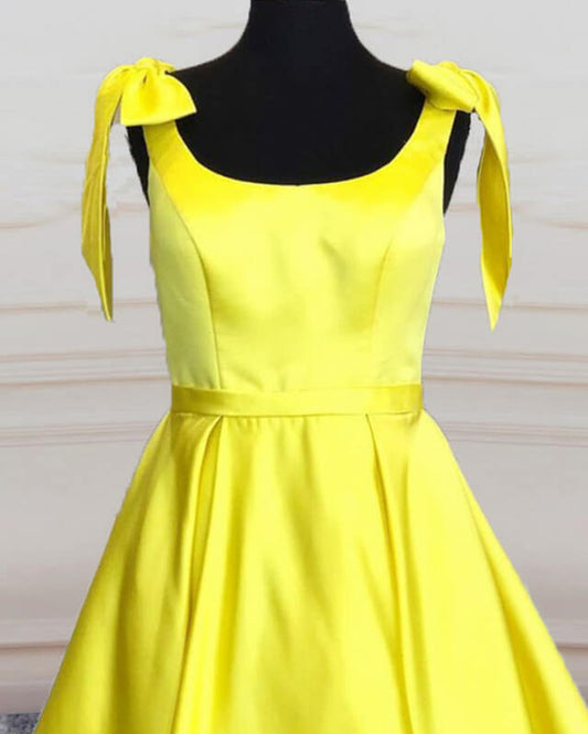 Short Yellow Satin Bow Shoulder Homecoming Dresses