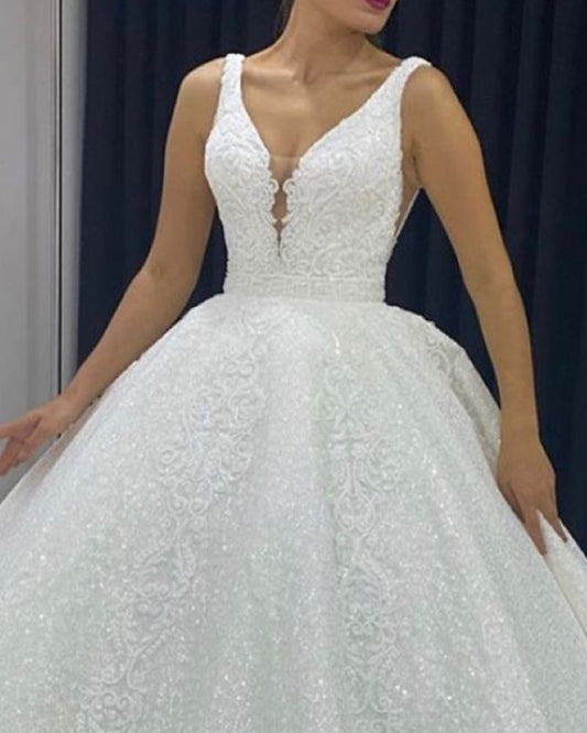 Plunge Neck Wedding Lace Ball Gown Dresses