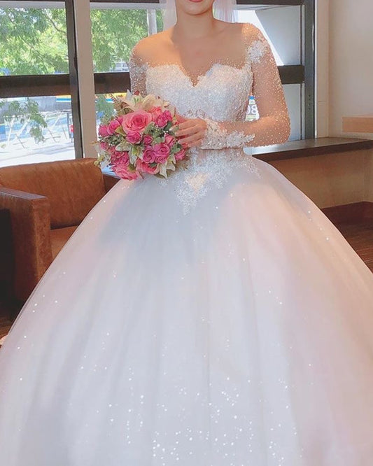 Sheer Neck Wedding Dress Beaded Long Sleeves