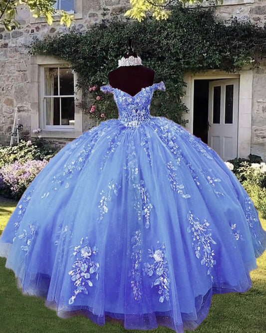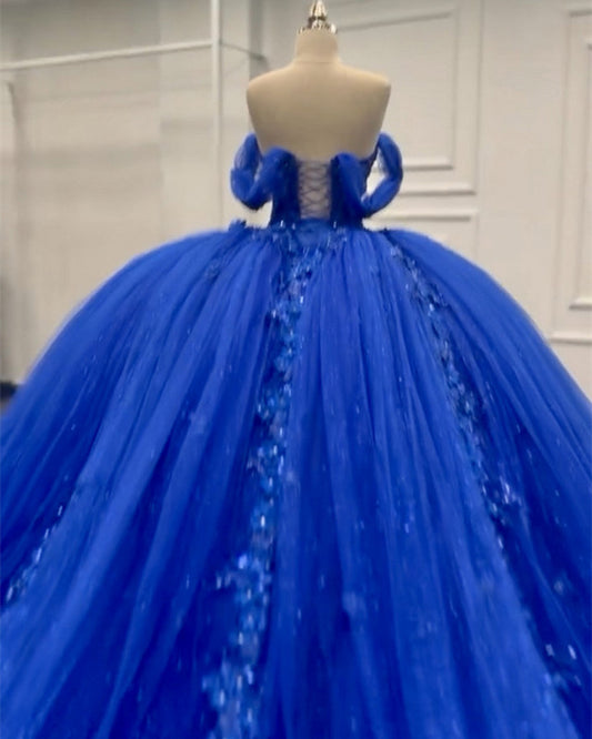 Royal Blue Tulle Off Shoulder Appliques Dress