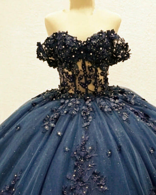Navy Tulle Corset Dress With 3D Lace Flowers