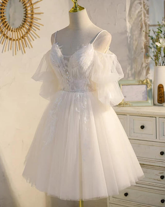 White Puffy Sleeve Organza Wedding Tea Length Dress
