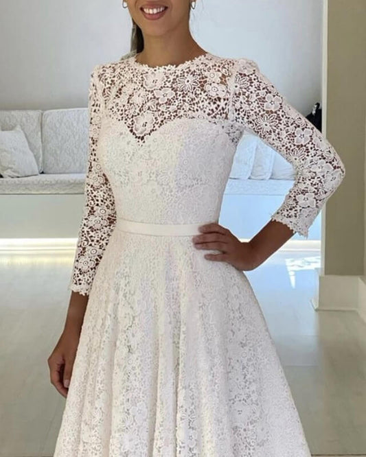 Modest Tea Length Lace Wedding Dresses With Sleeve