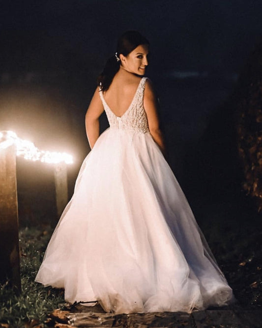 Tulle Destination Wedding Dresses V Neck Split Sequins Beaded