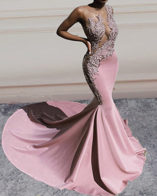 Lace Embroidery Prom Dresses Mermaid Sheer Neck