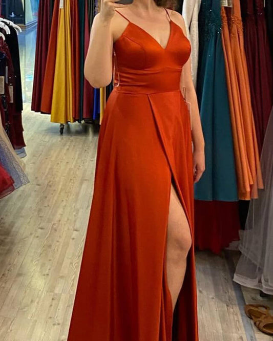Long Empire Satin V Neck Split Bridesmaid Dresses