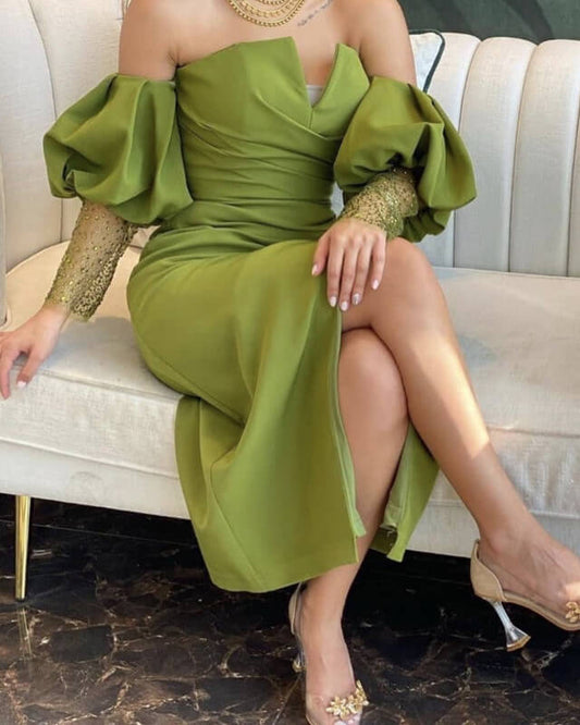 Mermaid Ruched Satin Off-the-shoulder dress with slit