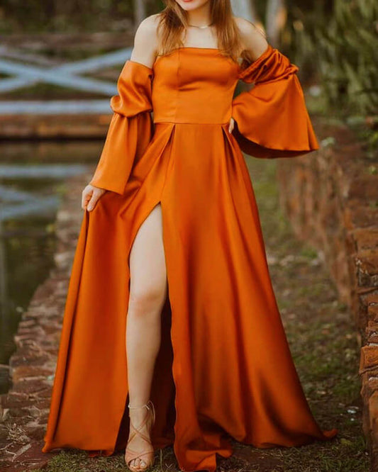 Long Burnt Orange Satin Bell Sleeve Bridesmaid Dresses