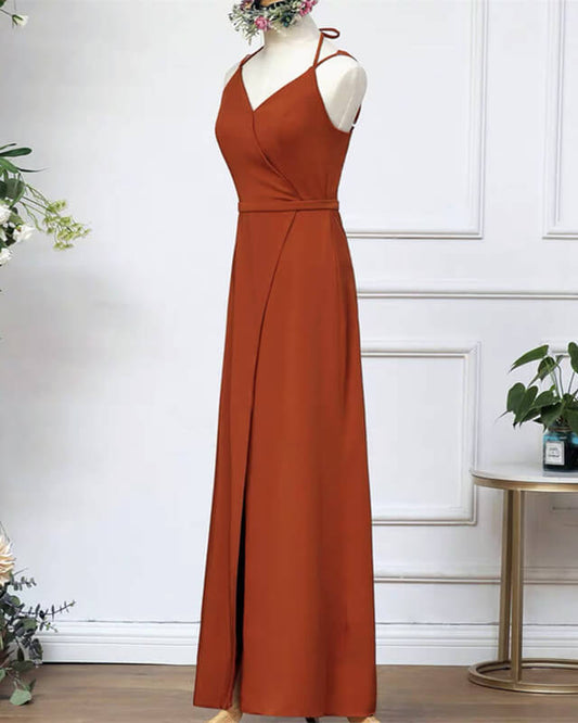 Burnt Orange Slit Bridesmaid Dresses With Straps