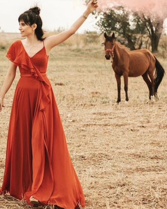 Long Pleated V Neck Bridesmaid Dresses with straps