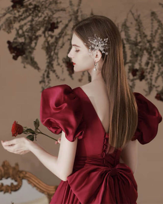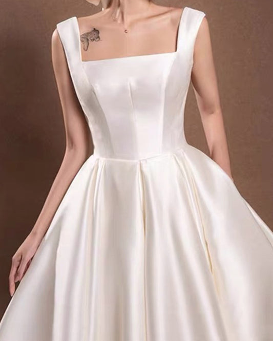 Puffy Sleeve Satin Midi Wedding Dress Wih Pockets