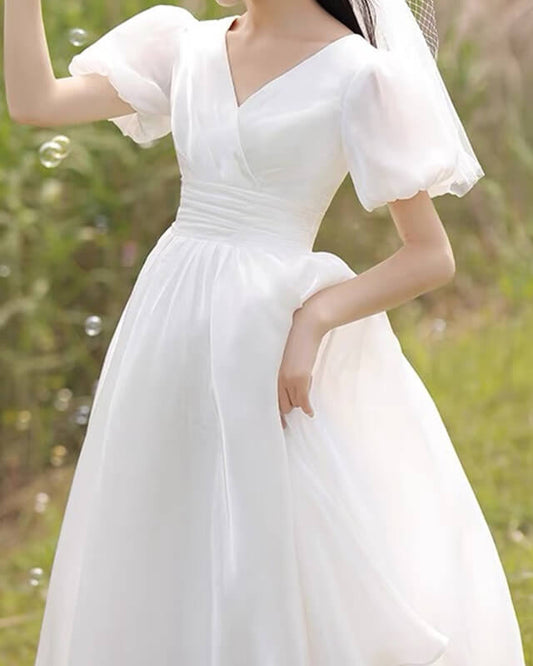 White Puffy Sleeve Organza Wedding Tea Length Dress