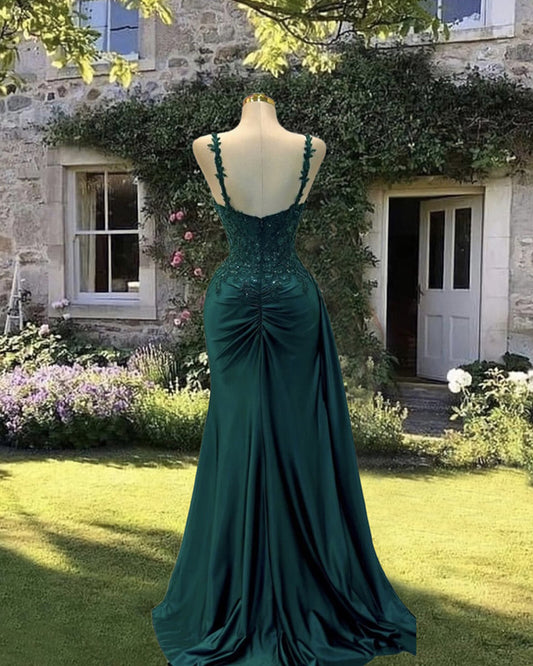 Mermaid Crystal Beaded Black Satin Slit Dress With Sleeves